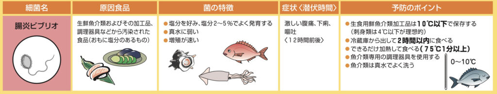 名前の通り、海水に生息する細菌であり、魚や貝などの海産物を介して人に感染します。